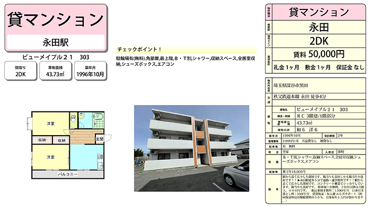 | 所在地 | 深谷市永田1445 ビューメイプル21 303号 |