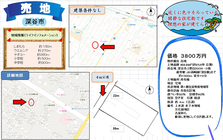 | 交通 | JR高崎線 深谷駅 約1,500m 徒歩19分 |